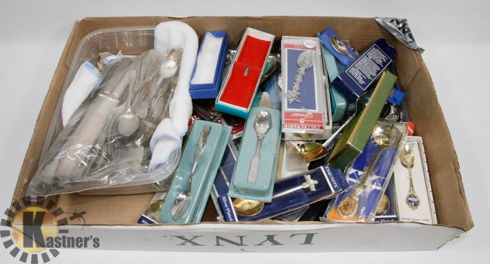 FLAT OF SILVER DINNERWARE & COLLECTOR SPOONS.