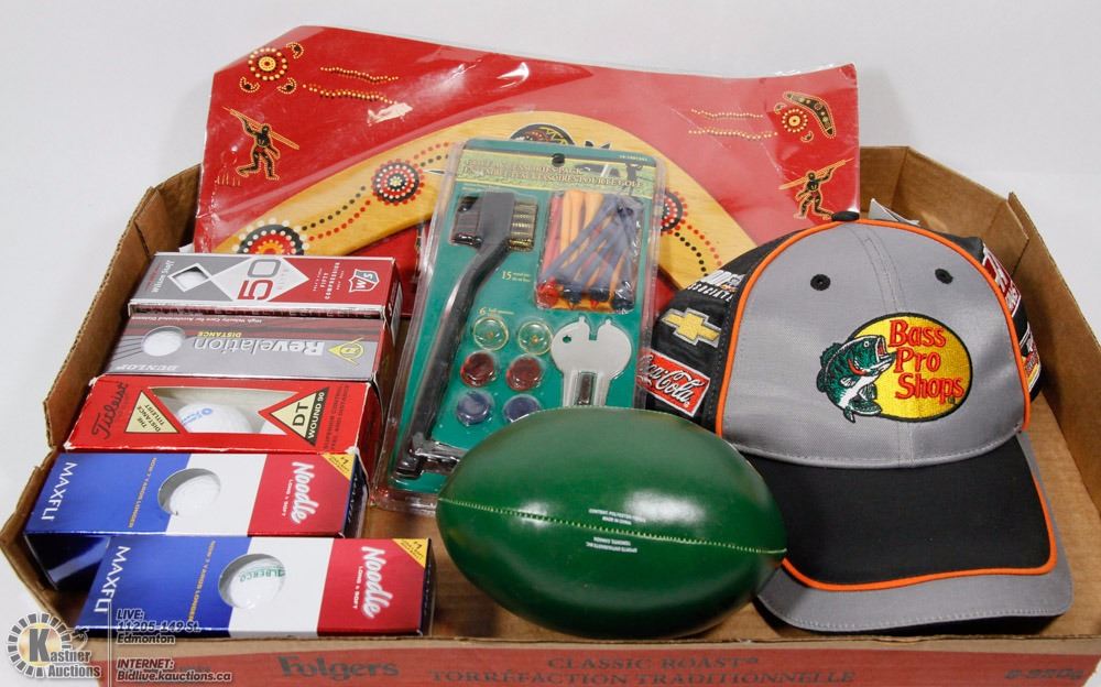 HAT, MINI SIGN ESKIMO FOOTBALL,BOOMERANG HANDPAINTED/RETURN, AUSTRALIA, 5 BOXES OF NEW GOLF BALLS, GOLF PACK ACCESSORIES