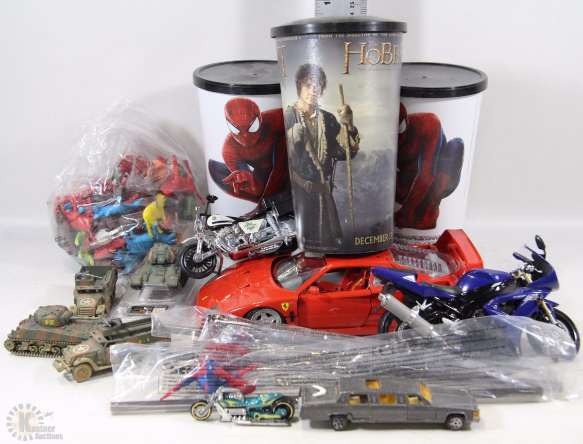 ANIMAL TOYS, RED 1987 F40 FERRARI 1:18 SCALE DIE CAST CAR MADE IN ITALY HAS OPENING DOORS, WORKING STEERING WHEEL, MOTORCYCLE TOYS AND ARMY TANKS