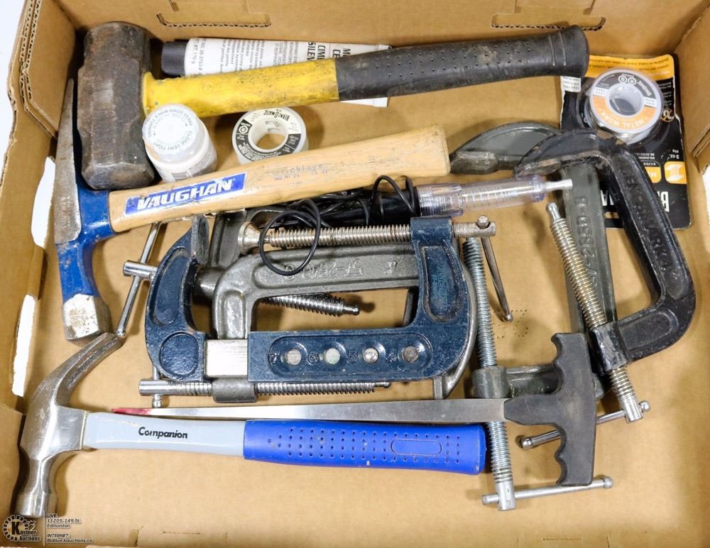 FLAT OF TOOLS - HAMMERS, C-CLAMPS, ETC.