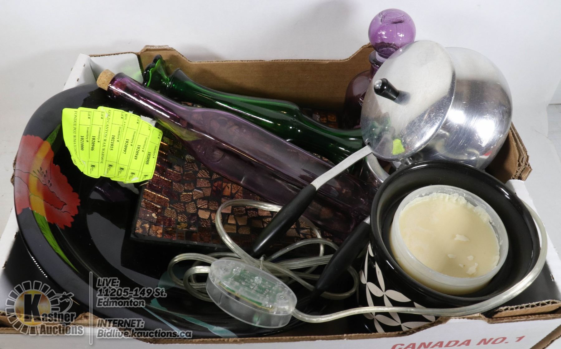 FONDUE POT, WAX WARMER,DECORATIVE BOTTLES, AND MORE