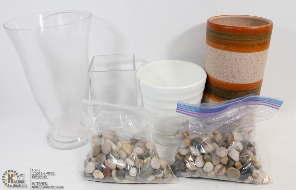 FLAT OF VASES AND DECORATIVE ROCKS