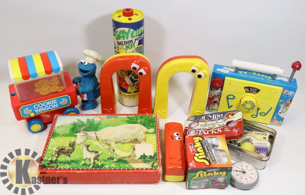 CUBE BLOCKS PICTURE PUZZLE, SEASAME STREET MONSTER COOKIE WAGON "WORKS", IDEAL STOP WATCH "WORKS" GAY SUR-LAXTEX BALLOON PUMP & MORE. COLLECTIBLES