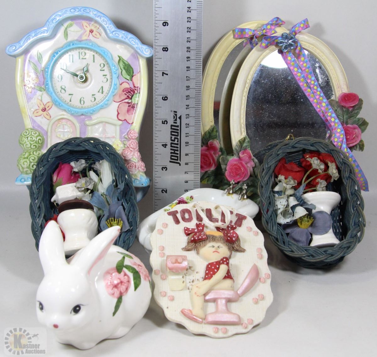 PORCELAIN WALL CLOCK, "TOILET" WALL ORNAMENT, RABBIT COTTON BALL HOLDER, MORE