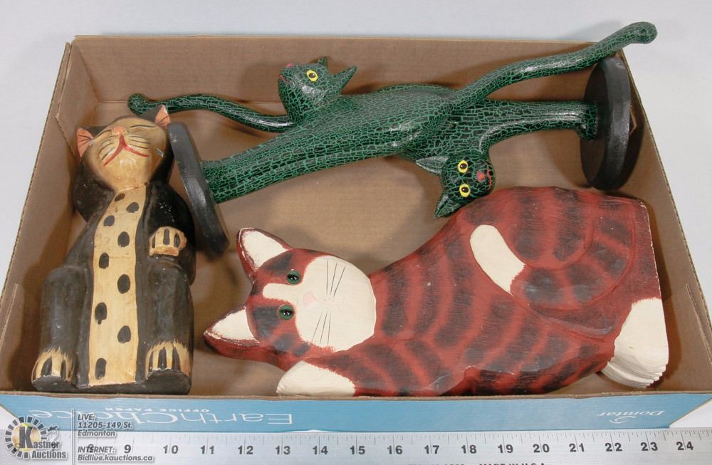 CATS OF VARIOUS SIZES AND SHAPES ALL MADE OF WOOD