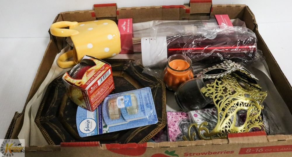 WALL HANGING MASKS, REED DIFFUSER WITH RATTAN STICKS, HAND PAINTED CERAMIC COASTERS, NEW RED LOCKABLE COFFEE MUG, FRAGRANCE CANDLES, ETC.