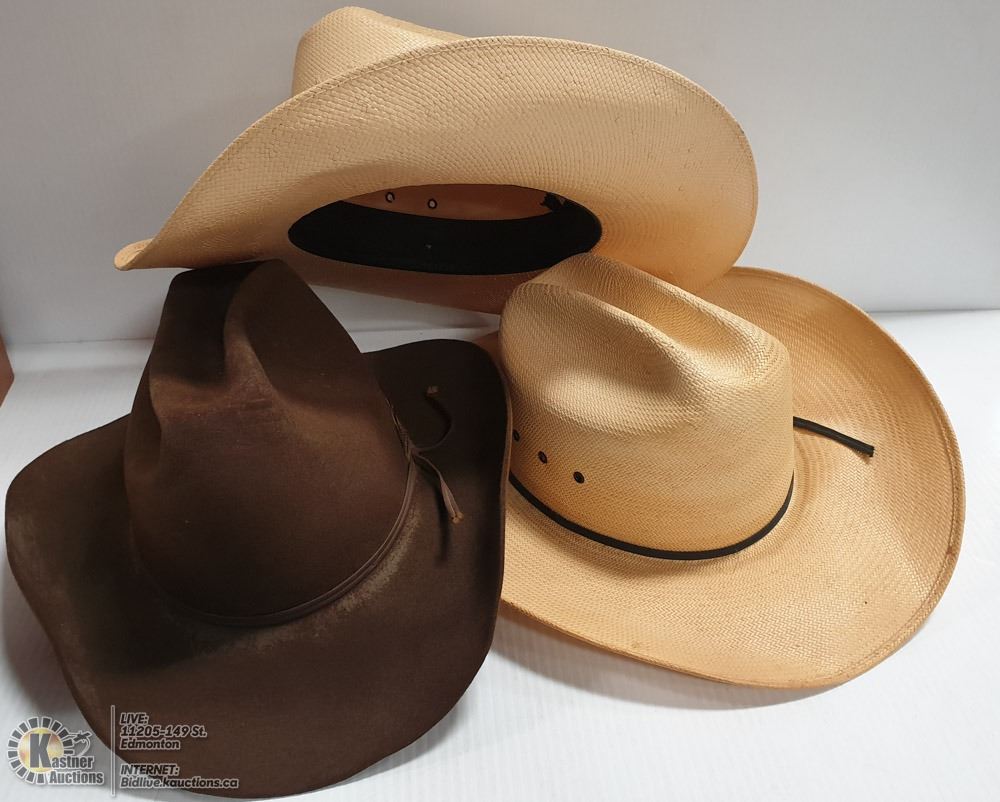 (SIZE 7 1/8) - DARK BROWN FELT "STETSON", BAILEY U-ROLLIT STRAW COWBOY HAT AND DOKKER PACIFIC STRAW HAT - COLLECTIBLES