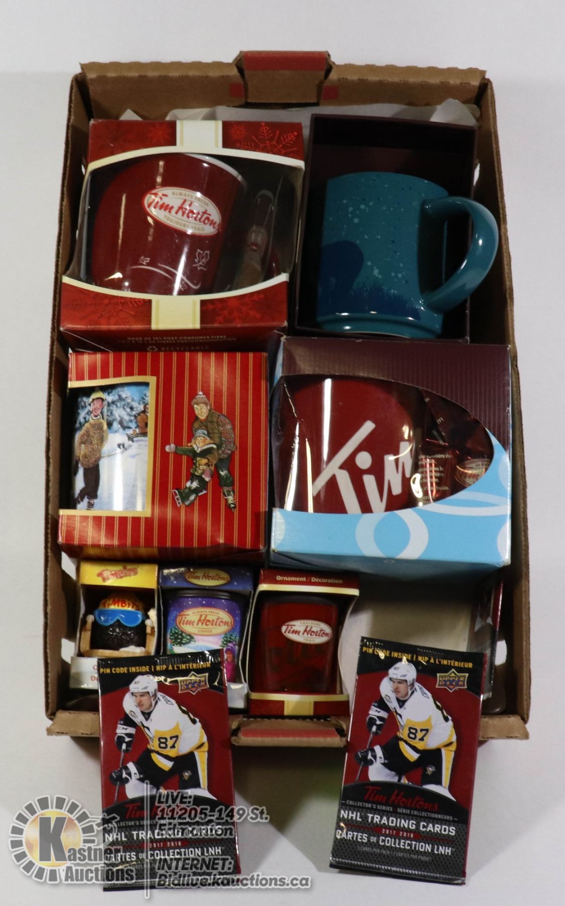 (2 WITH SCENIC DESIGNS), 3 ORNAMENT TIM HORTONS COLLECTIBLES AND 3 UNOPENED NHL TRADING CARDS