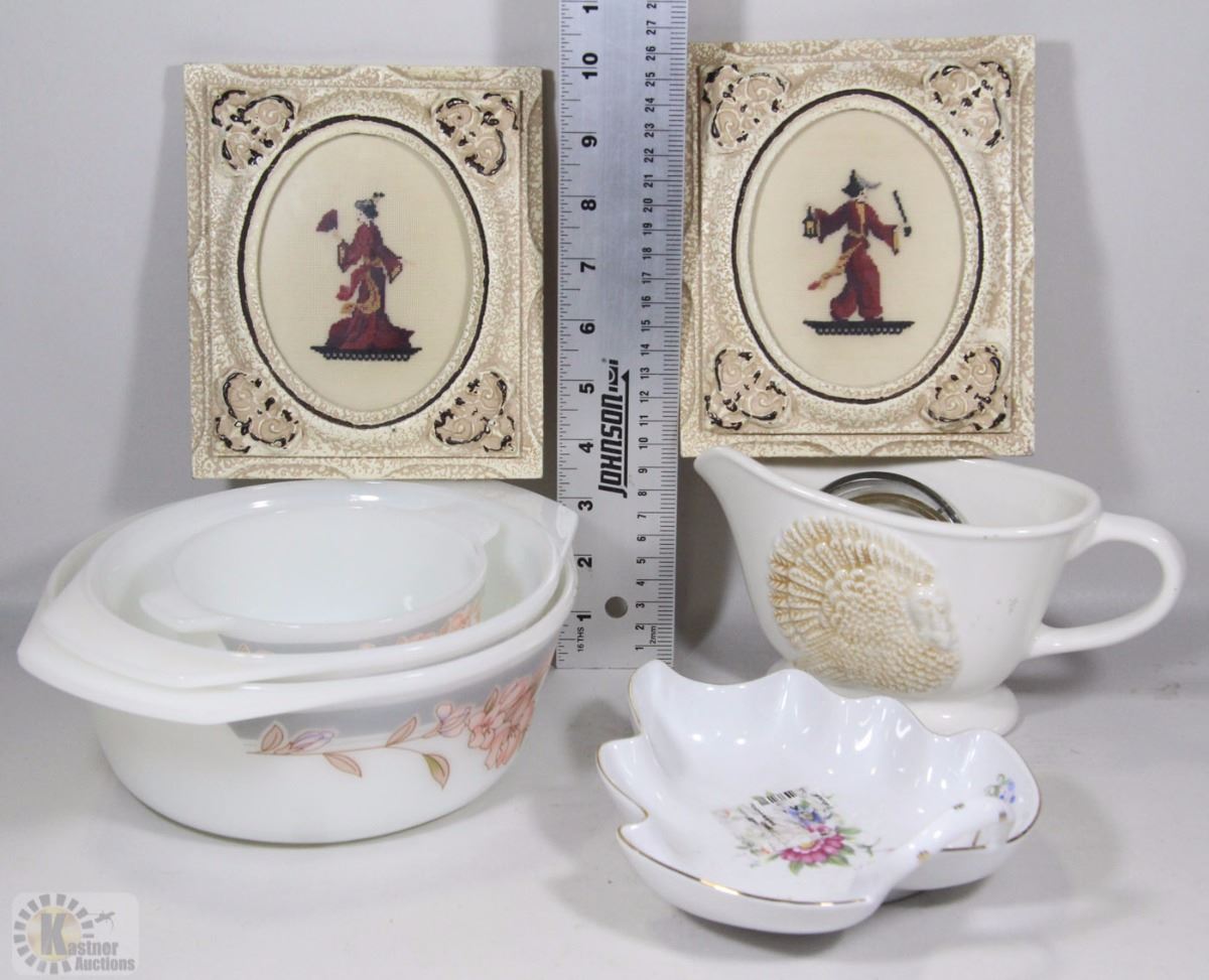 PAIR OF ORIENTAL PICTURES, WHITE/GOLD TRIM LEAF TRAY