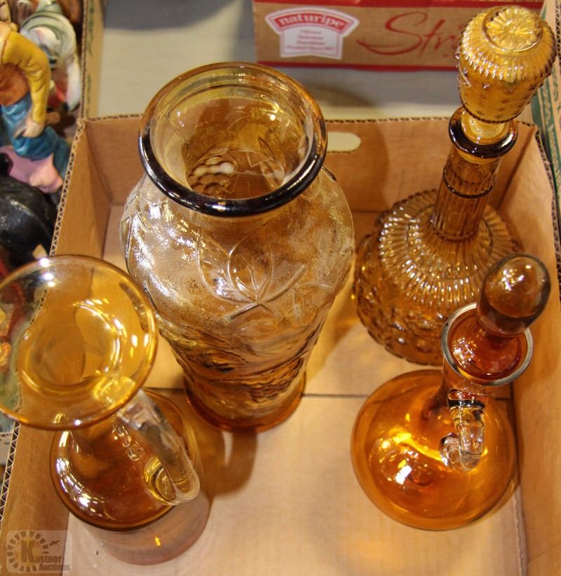 FLAT WITH AMBER DECANTER, JUG, VASE,