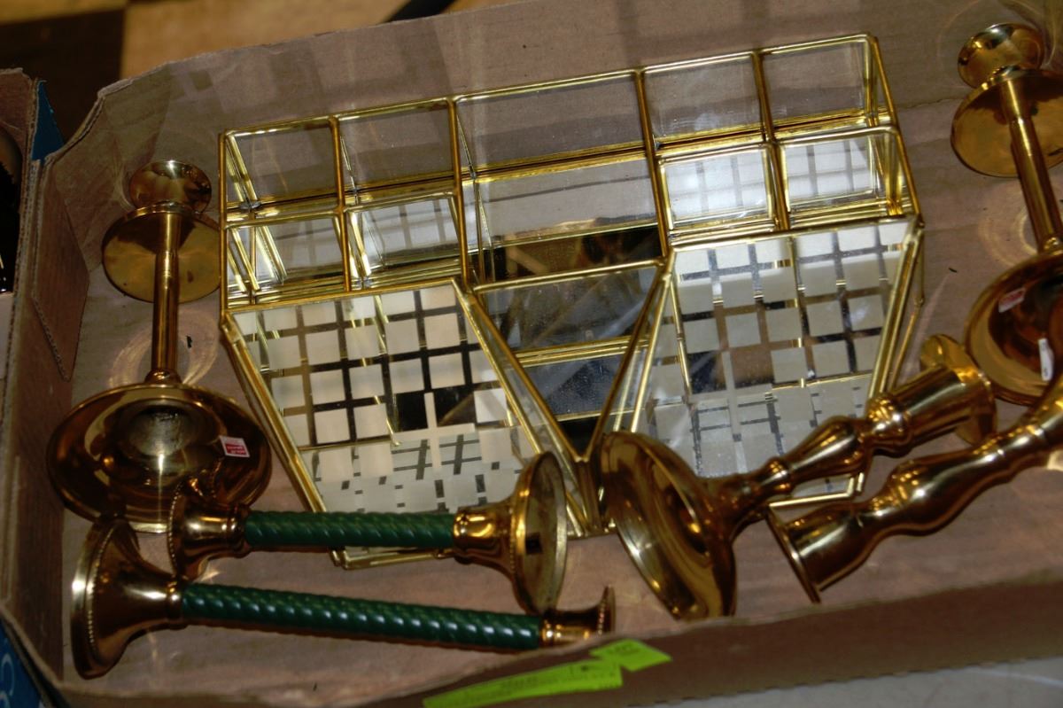FLAT WITH BRASS GLASS DISPLAY & CANDLESTICKS