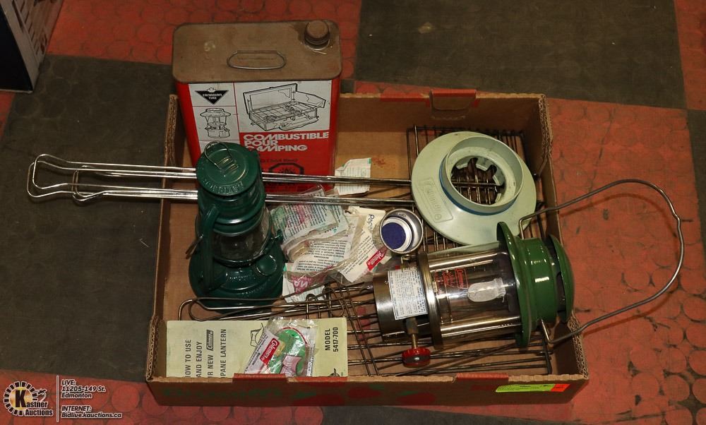 FLAT WITH CAMPING ITEMS, LANTERNS, OIL