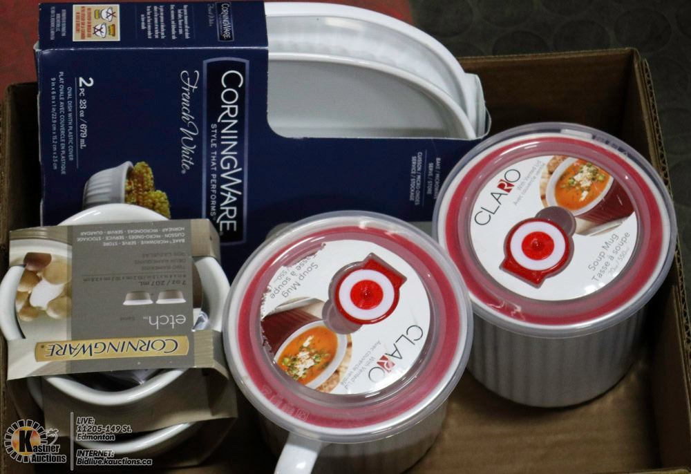 DISH WITH COVER, 2 CLARO SOUP MUGS