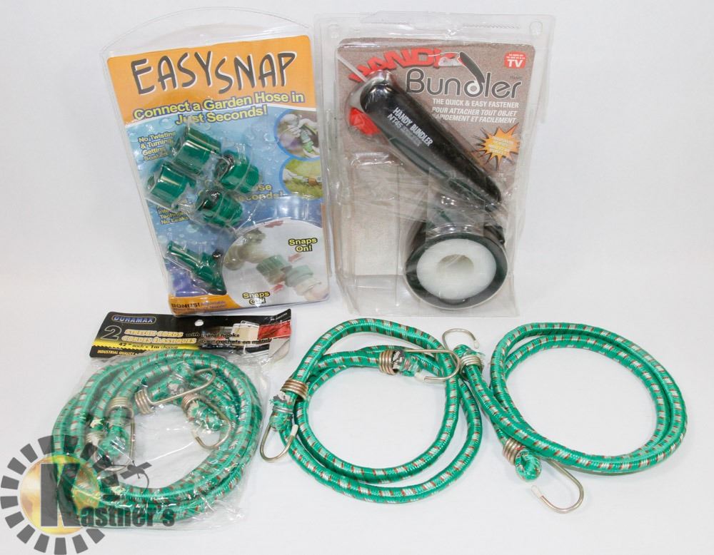 SET, HANDY BUNDLER, AND FOUR SET OF 42" LONG BUNGEE CORDS WITH METAL HOOKS.