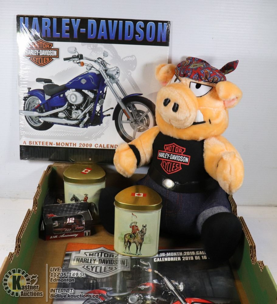 COLLECTIBLE RCMP TINS, 2 COLLECTIBLE UNOPENED HARLEY-DAVIDSON CALENDARS (2009 & 2019) AND 2 COLLECTIBLE DIE CAST CARS IN BOXES