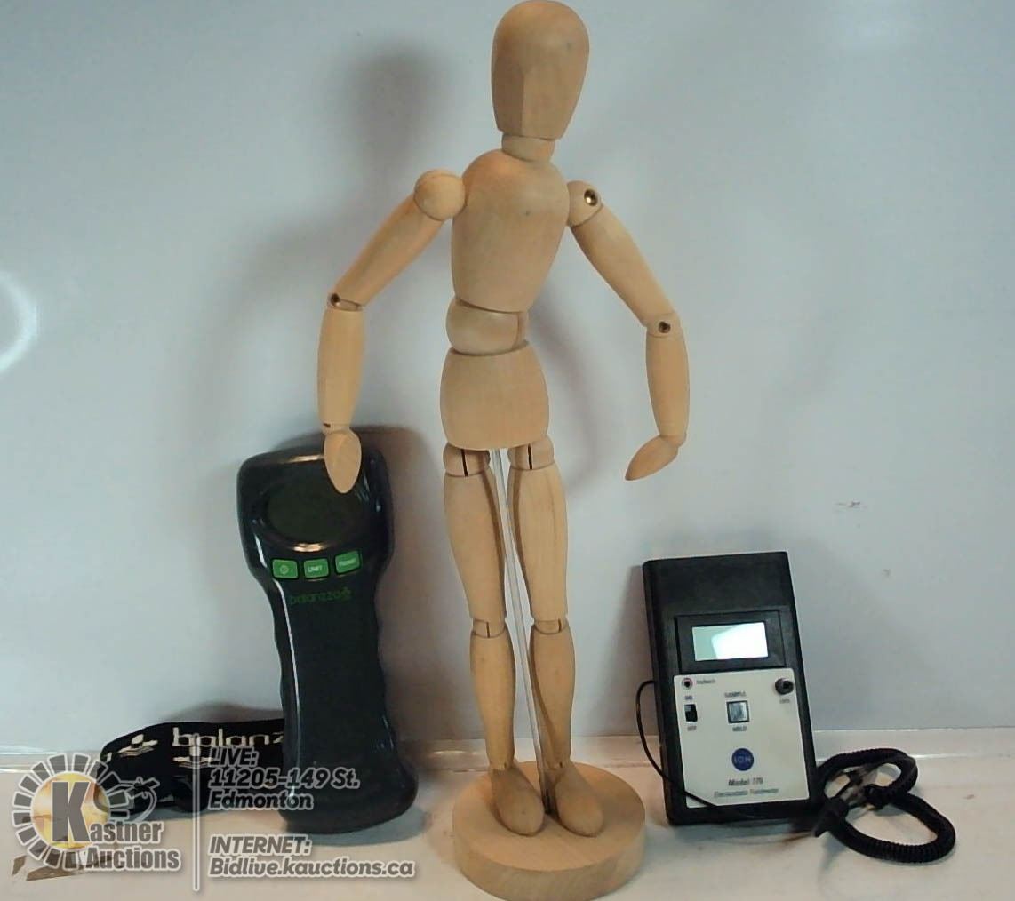ELECTROSTATIC FIELDMETER, BALANZZA HAND-HELD LUGGAGE SCALE UP TO 100 LB/44 KG CAPACITY, STANDING POSEABLE WOOD HUMAN FIGURE 13 INCHES TALL