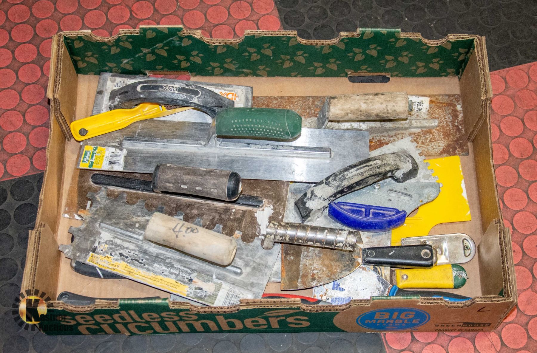 CEMENT AND TILE TOOLS, TROWELS, SEVERAL SIZE AND TYPES OF SCRAPERS, FINISHING TROWEL, GROUT FLOAT, ETC. **ALL ITEMS MUST BE REMOVED BY 5PM SATURDAY, OCTOBER 7TH 2023. ALL REMAINING ITEMS WILL BE SUBJECT TO A $6.00 PER DAY STORAGE CHARGE. ANY ITEMS REMAINING AFTER MONDAY, OCTOBER 23RD, 2023 WILL BE CONSIDERED FORFEITED. NO REFUNDS WILL BE ISSUED FOR FORFEITED ITEMS. TO SCHEDULE A PICK UP APPOINTMENT CLICK HERE