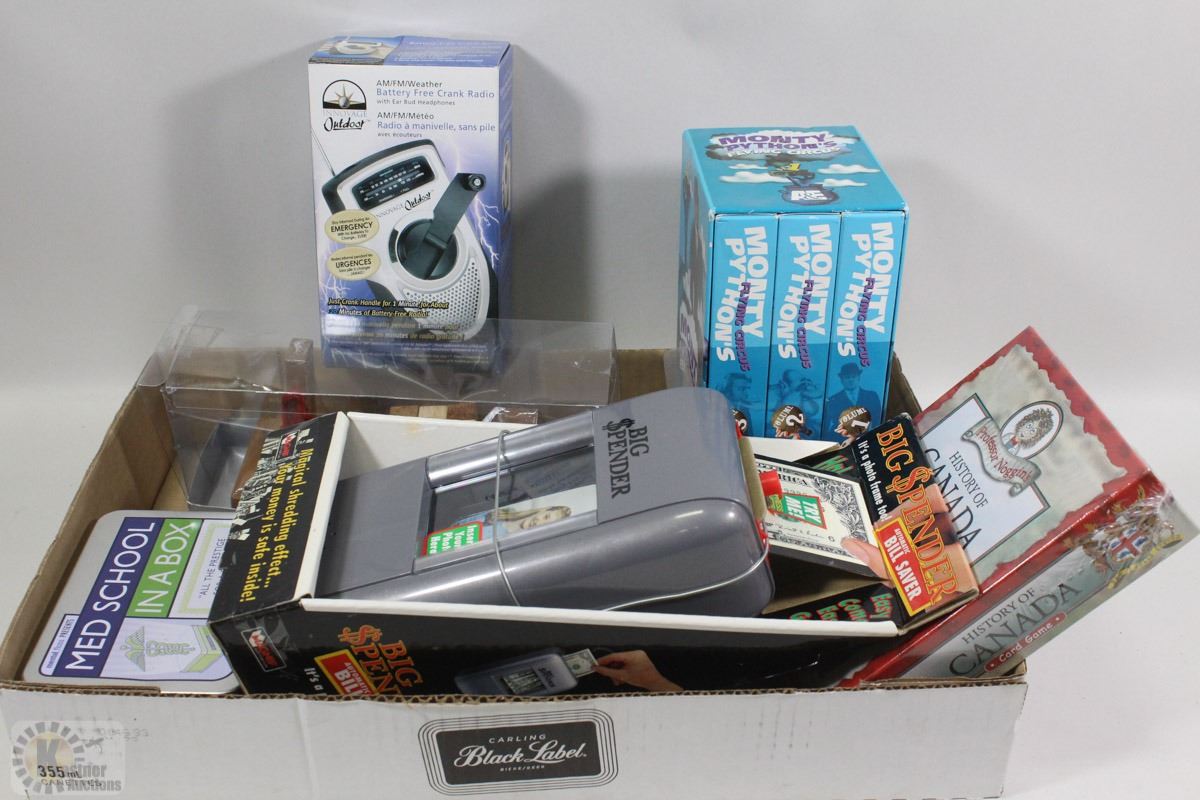 BILL SPENDER MAGIC TRICK, WOODEN TOYS, MED SCHOOL IN A BOX, AM/FM WEATHER BATTER FREE CLOCK