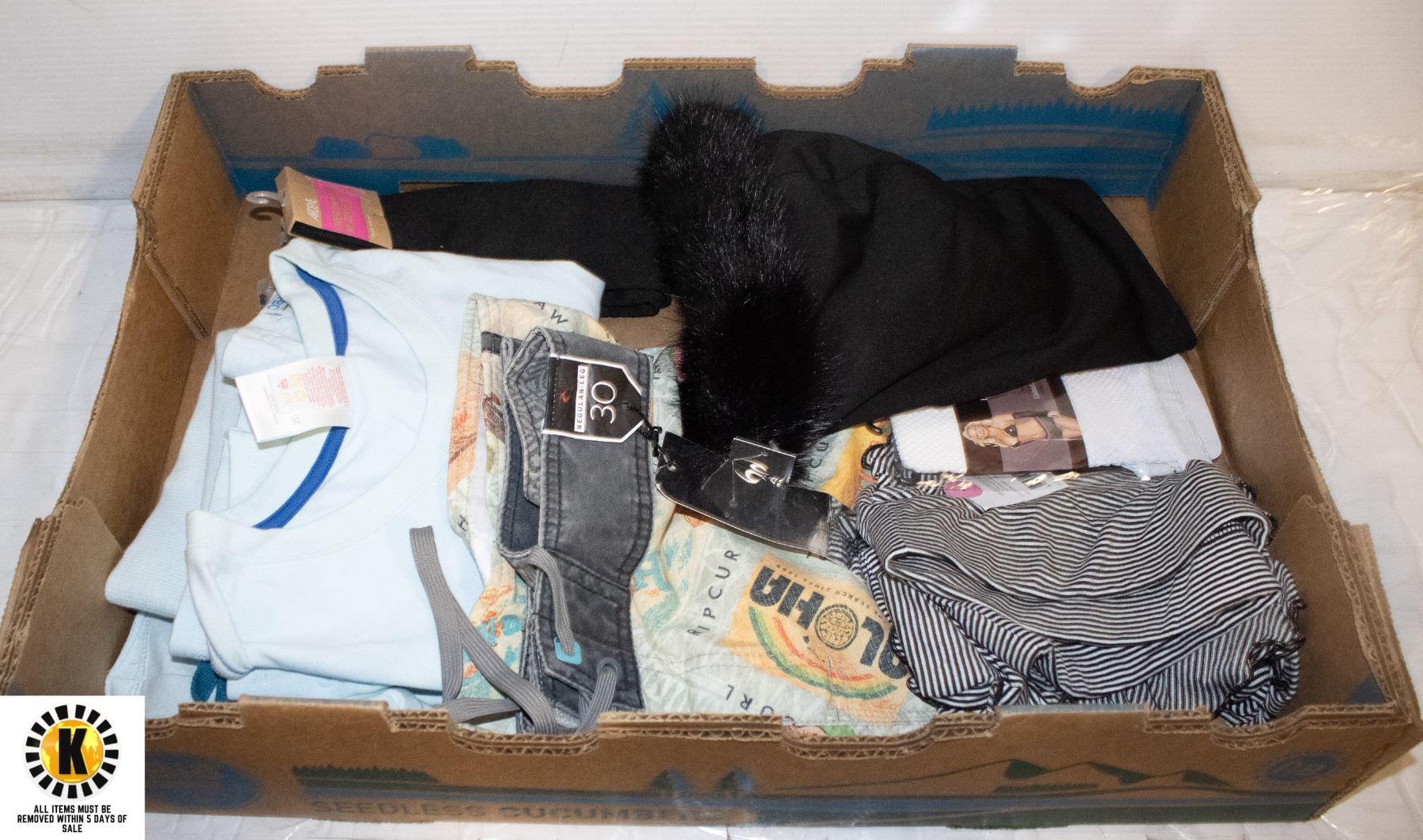 WARMERS, OVER THE KNEE STOCKINGS, WOMEN'S 2-PIECE LOUNGE OUTFIT SIZE L, LADIES SKIRT (L), FOREVER 21 TUBE TOP WITH FAUX FUR TRIM (XL), AND MEN'S RIP CURL BOARD SHORTS (SIZE 30 WAIST)
