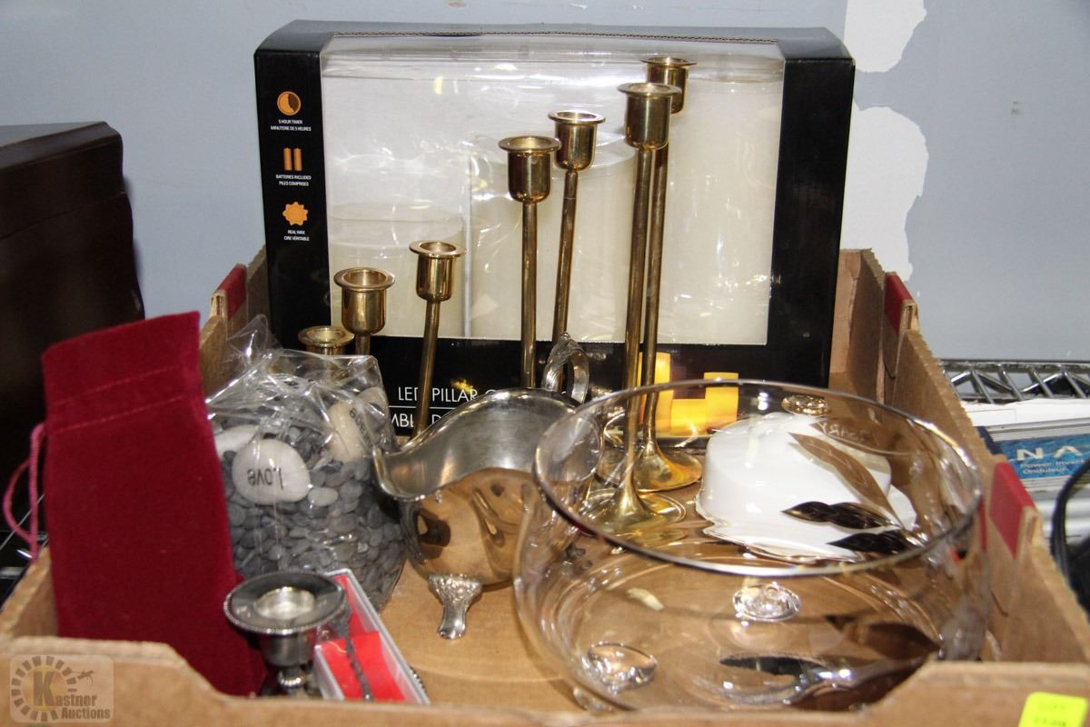 SAYING ROCKS, BRASS CANDLEHOLDERS, DUCHESS SUGARBOWL, GLASS FOOTED CANDY DISH AND MORE