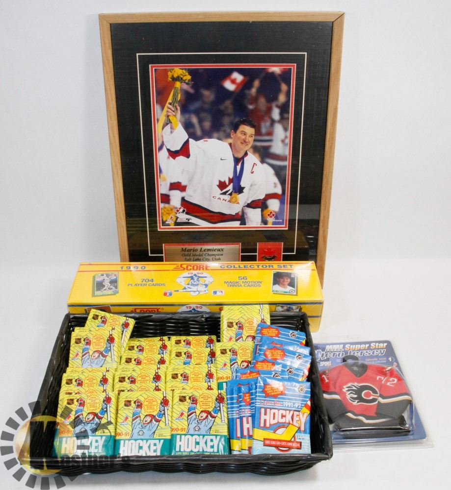 SINGLES 1990-1992 W/BOX OF SCORE COLLECTION 1990 (704) CARDS 56 MAGIC MOTION & MARIO LEMIEAUX GOLD MEDAL PLAQUE & MORE.