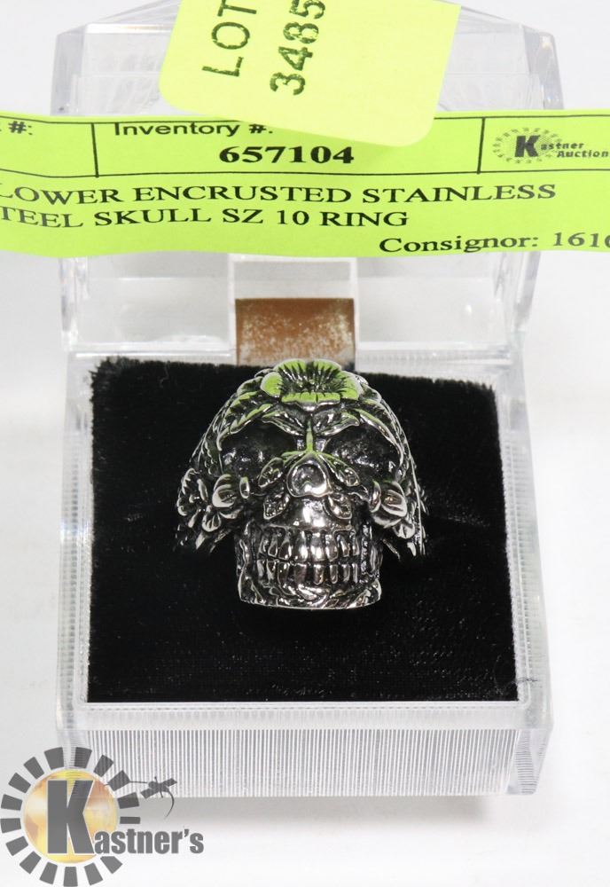 FLOWER ENCRUSTED STAINLESS STEEL SKULL SZ 10 RING