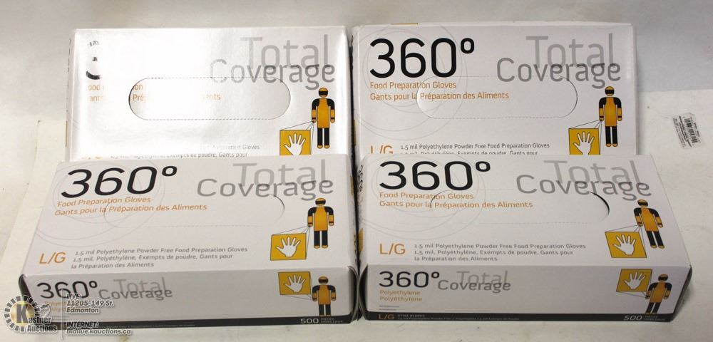 2,000 NEW CFIA APPROVED GLOVES, 360 TOTAL COVERAGE, POLYETHYLENE, 1.5MIL THICKNESS, 500 GLOVES PER BOX , 4 BOXES PER CASE - SIZE LARGE - AS THEY COME IN CATALOGUE ORDER