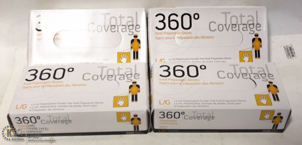 2,000 NEW CFIA APPROVED GLOVES, 360 TOTAL COVERAGE, POLYETHYLENE, 1.5MIL THICKNESS, 500 GLOVES PER BOX , 4 BOXES PER CASE - SIZE LARGE - AS THEY COME IN CATALOGUE ORDER