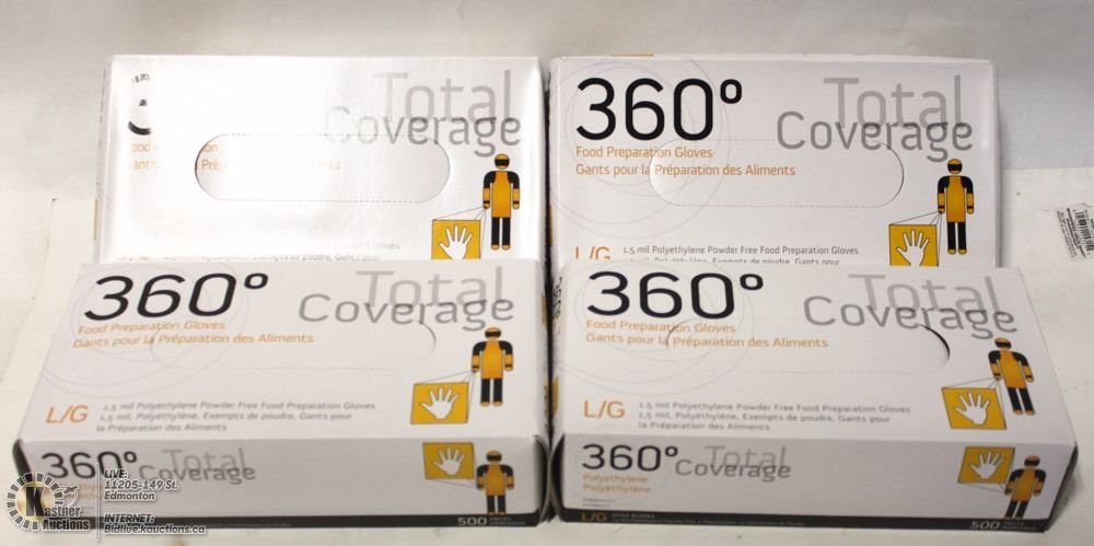 2,000 NEW CFIA APPROVED GLOVES, 360 TOTAL COVERAGE, POLYETHYLENE, 1.5MIL THICKNESS, 500 GLOVES PER BOX , 4 BOXES PER CASE - SIZE LARGE - AS THEY COME IN CATALOGUE ORDER