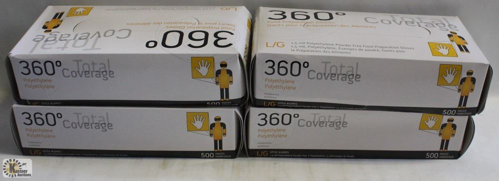 2,000 NEW CFI A APPROVED GLOVES, 360 TOTAL COVERAGE, POLYETHYLENE, 1.5MIL THICKNESS, 500 GLOVES PER BOX , 4 BOXES PER CASE - SIZE LARGE