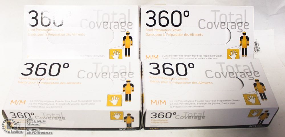 2,000 NEW CFIA APPROVED GLOVES, 360 TOTAL COVERAGE, POLYETHYLENE, 1.5MIL THICKNESS, 500 GLOVES PER BOX , 4 BOXES PER CASE - SIZE MEDIUM - AS THEY COME IN CATALOGUE ORDER