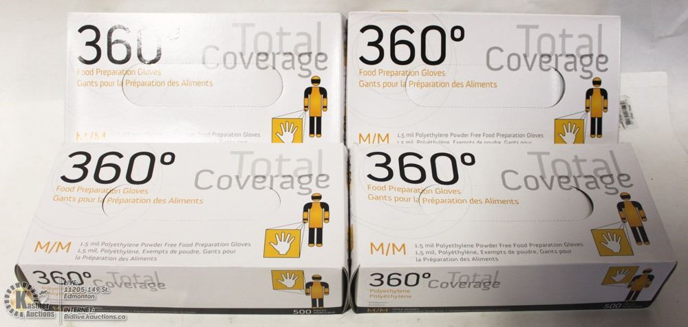 2,000 NEW CFIA APPROVED GLOVES, 360 TOTAL COVERAGE, POLYETHYLENE, 1.5MIL THICKNESS, 500 GLOVES PER BOX , 4 BOXES PER CASE - SIZE MEDIUM - AS THEY COME IN CATALOGUE ORDER
