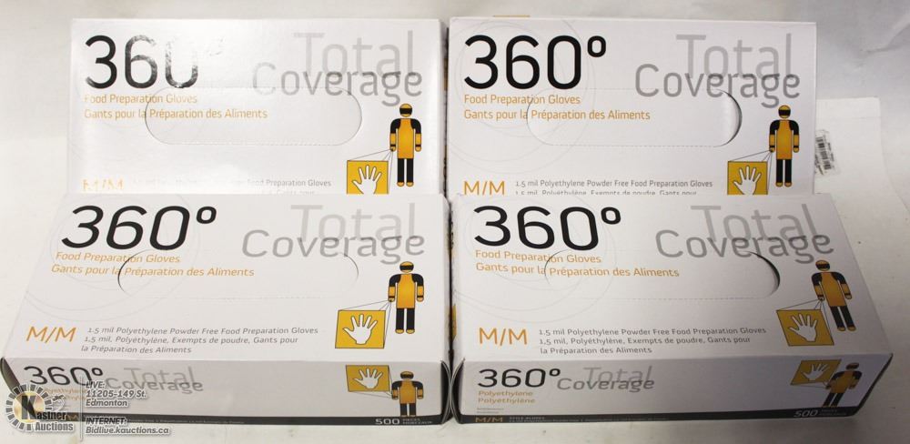 2,000 NEW CFIA APPROVED GLOVES, 360 TOTAL COVERAGE, POLYETHYLENE, 1.5MIL THICKNESS, 500 GLOVES PER BOX , 4 BOXES PER CASE - SIZE MEDIUM - AS THEY COME IN CATALOGUE ORDER