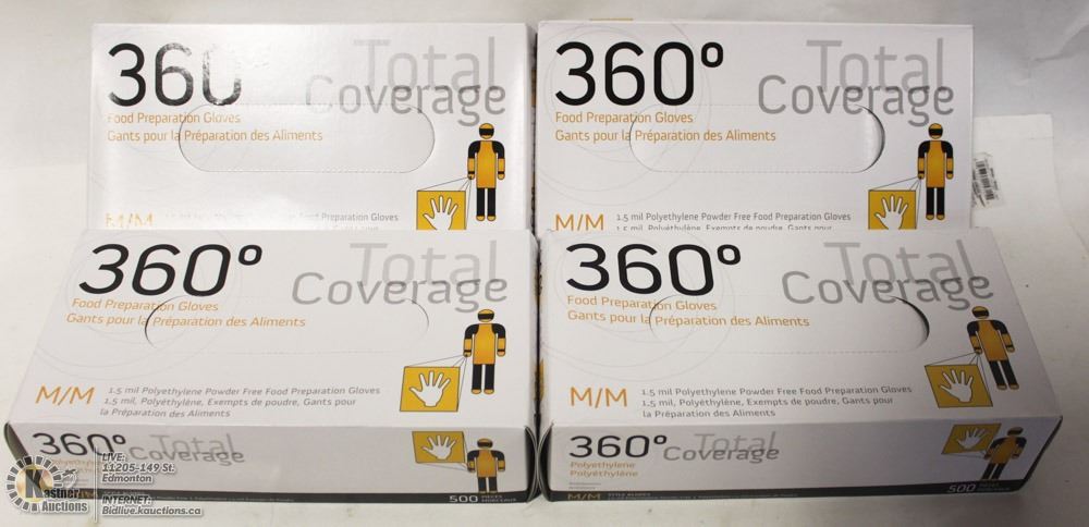 2,000 NEW CFIA APPROVED GLOVES, 360 TOTAL COVERAGE, POLYETHYLENE, 1.5MIL THICKNESS, 500 GLOVES PER BOX , 4 BOXES PER CASE - SIZE MEDIUM - AS THEY COME IN CATALOGUE ORDER