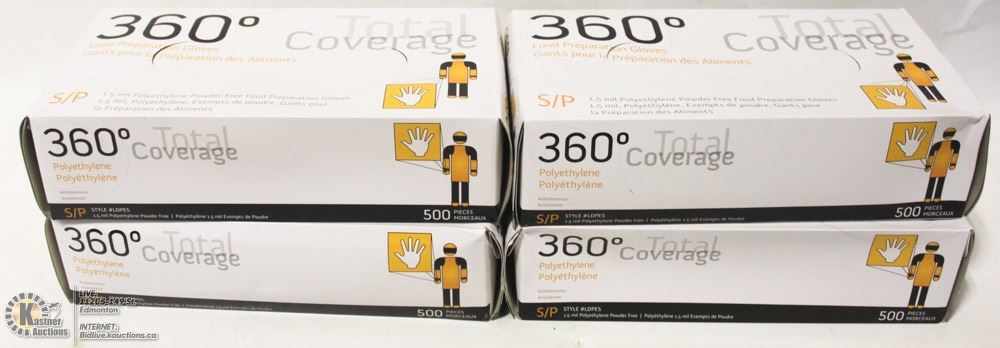 2,000 NEW CFIA APPROVED GLOVES, 360 TOTAL COVERAGE, POLYETHYLENE, 1.5MIL THICKNESS, 500 GLOVES PER BOX , 4 BOXES PER CASE - SIZE SMALL - AS THEY COME IN CATALOGUE ORDER