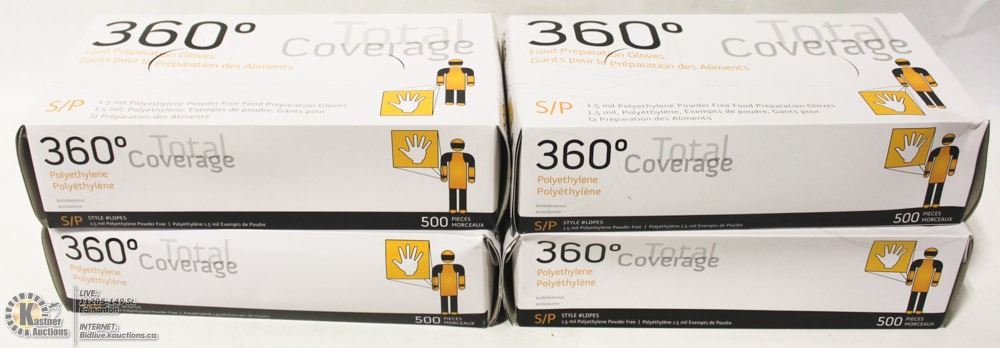 2,000 NEW CFIA APPROVED GLOVES, 360 TOTAL COVERAGE, POLYETHYLENE, 1.5MIL THICKNESS, 500 GLOVES PER BOX , 4 BOXES PER CASE - SIZE SMALL - AS THEY COME IN CATALOGUE ORDER