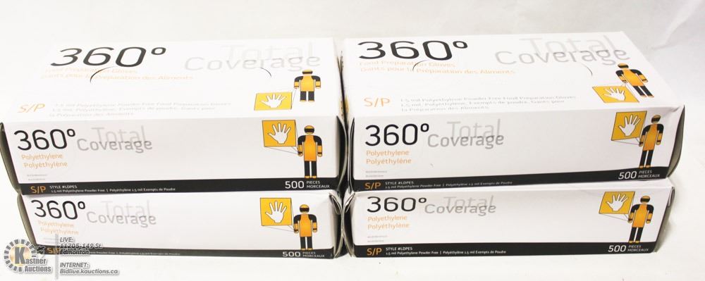 2,000 NEW CFIA APPROVED GLOVES, 360 TOTAL COVERAGE, POLYETHYLENE, 1.5MIL THICKNESS, 500 GLOVES PER BOX , 4 BOXES PER CASE - SIZE SMALL - AS THEY COME IN CATALOGUE ORDER