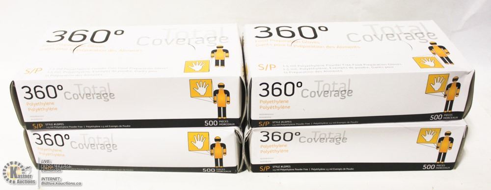 2,000 NEW CFIA APPROVED GLOVES, 360 TOTAL COVERAGE, POLYETHYLENE, 1.5MIL THICKNESS, 500 GLOVES PER BOX , 4 BOXES PER CASE - SIZE SMALL - AS THEY COME IN CATALOGUE ORDER