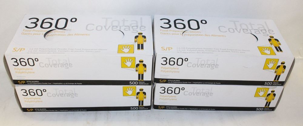 2,000 NEW CFI A APPROVED GLOVES, 360 TOTAL COVERAGE, POLYETHYLENE, 1.5MIL THICKNESS, 500 GLOVES PER BOX , 4 BOXES PER CASE - SIZE SMALL - AS THEY COME