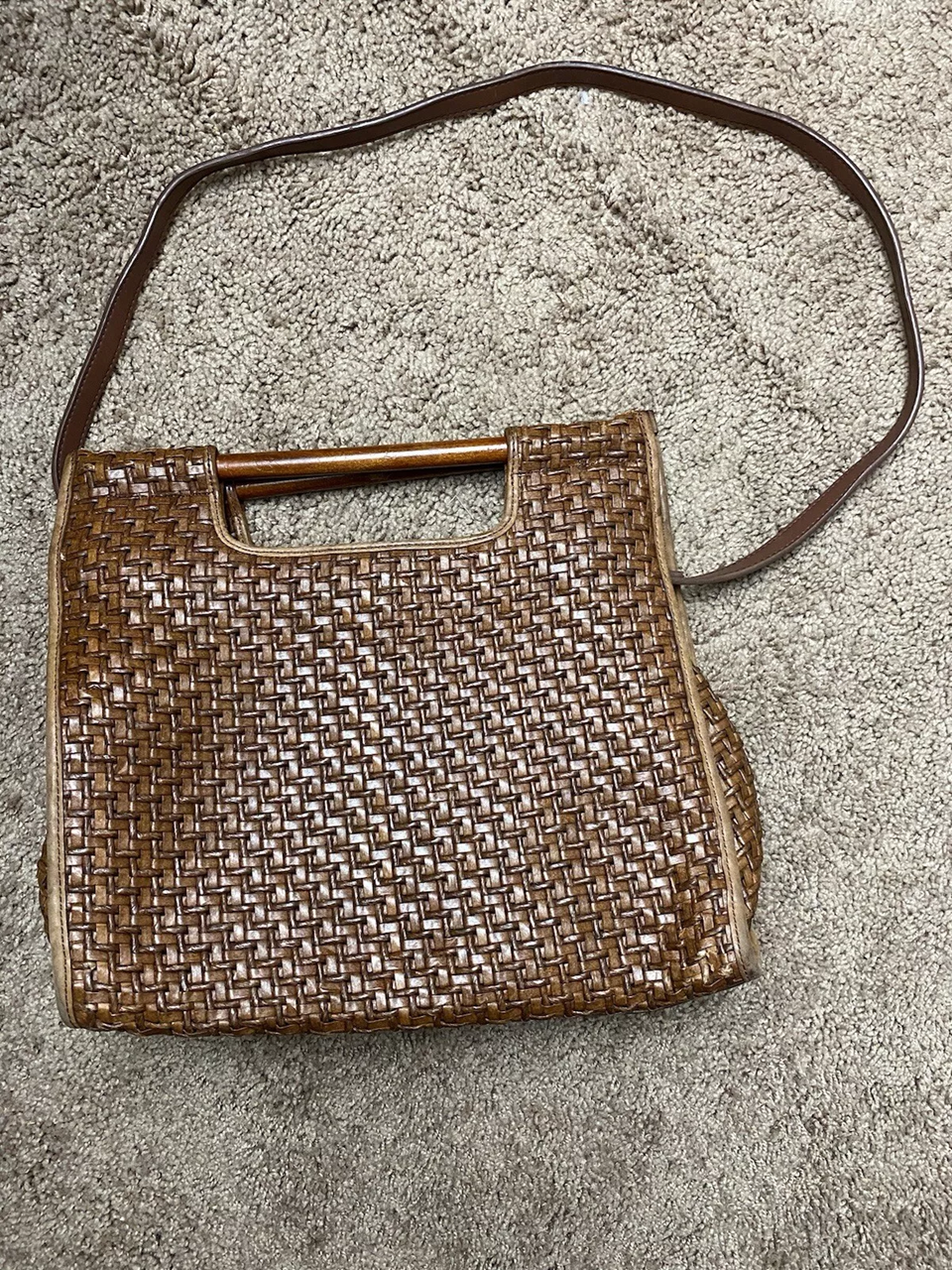 FOSSIL WOVEN STRAW HAND BAG LEATHER TRIM WOOD HANDLES BOHEMIAN PURSE | Category: Home Goods & Décor