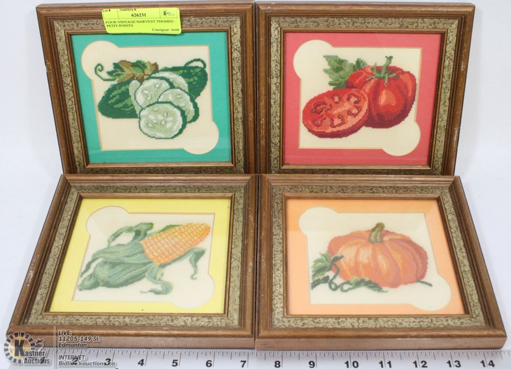 FOUR VINTAGE HARVEST THEMED PETIT-POINTS