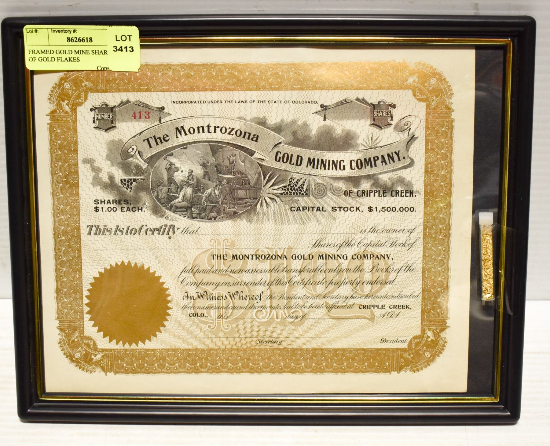 FRAMED GOLD MINE SHARE W/ VIAL OF GOLD FLAKES