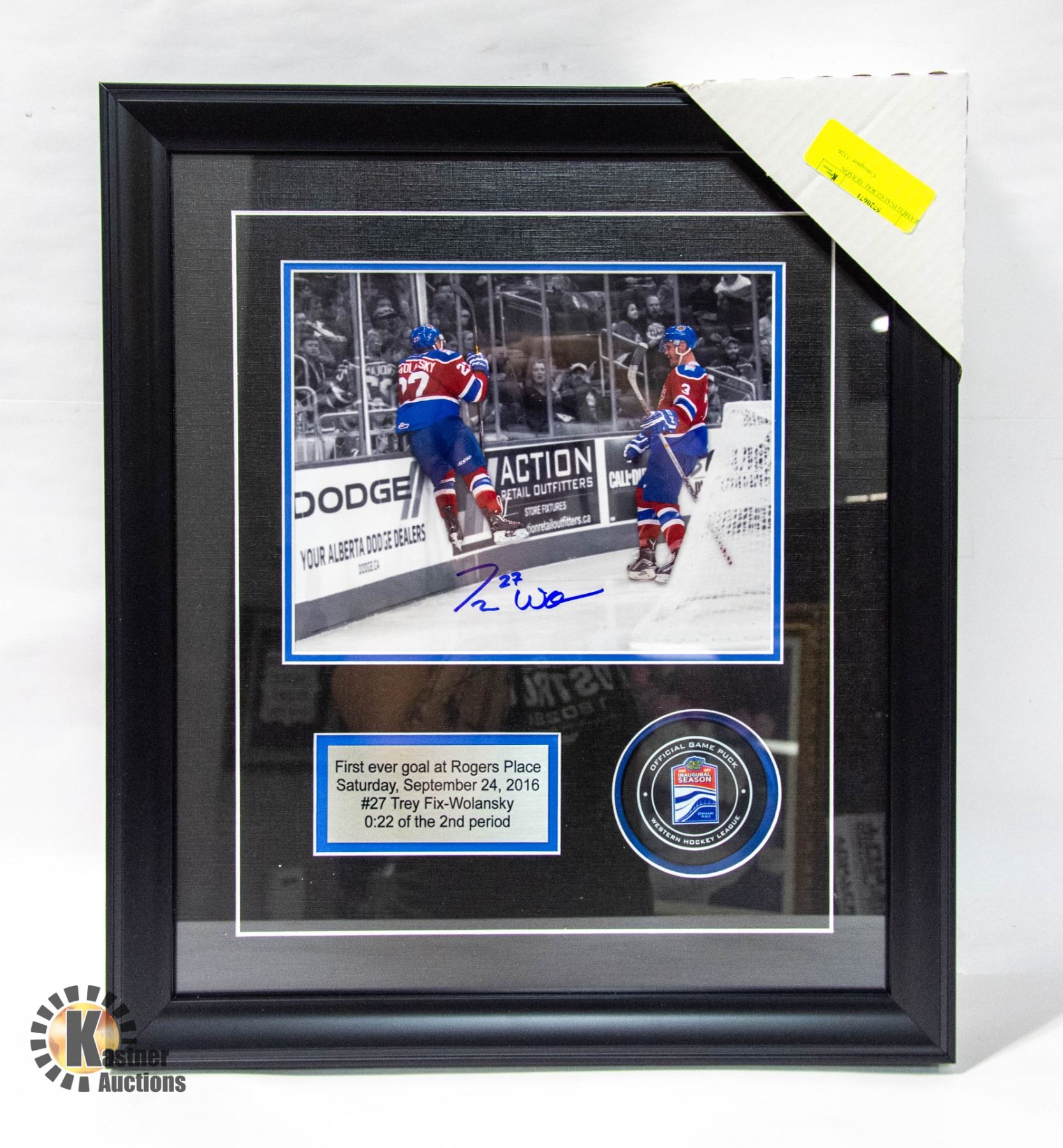 2016 FIRST EVER GOAL AT ROGERS PLACE EDMONTON OIL KINGS WITH PUCK 2016 #27 TREY FIX-WOLANSKY 0.22. OF THE 2ND PERIOD SIGNED 17" X 19 1/2" APPROX. **ALL ITEMS MUST BE REMOVED BY 5PM SATURDAY, NOVEMBER 4TH 2023. ALL REMAINING ITEMS WILL BE SUBJECT TO A $6.00 PER DAY STORAGE CHARGE. ANY ITEMS REMAINING AFTER MONDAY, NOVEMBER 18TH, 2023 WILL BE CONSIDERED FORFEITED. NO REFUNDS WILL BE ISSUED FOR FORFEITED ITEMS. TO SCHEDULE A PICK UP APPOINTMENT CLICK HERE