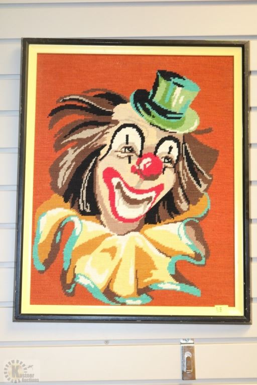 FRAMED NEEDLE POINT CLOWN PICTURE