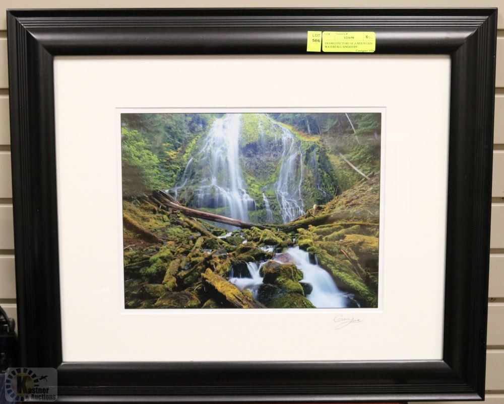 FRAMED PICTURE OF A MOUNTAIN WATERFALL SINGED BY