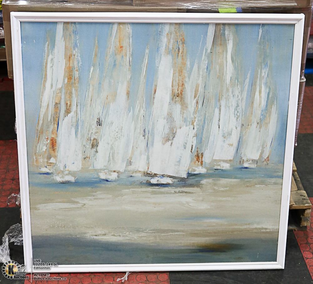 SHADES OF BLUE WATER AND SKY WITH WHITE SAILBOATS MEASURES 35 1/2" X 35 1/2".