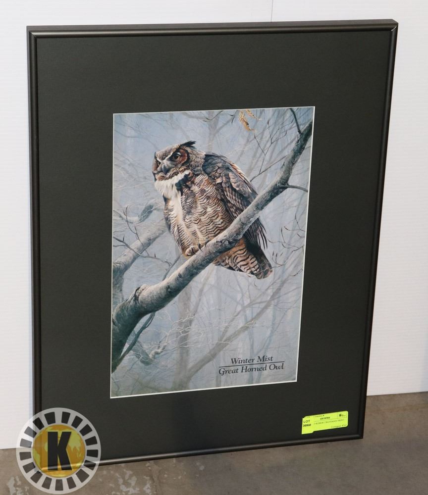 FRAMED ROBERT BATEMAN PRINT -24" L X 18.5" W " WINTER MIST-GREAT HORNED OWL"- NONE***ITEM IS LOCATED IN LETHBRIDGE AB