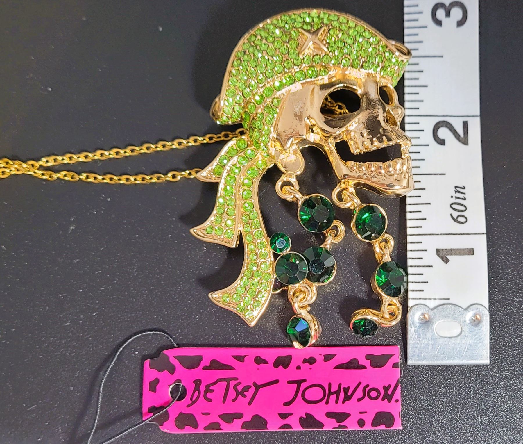 GOLD TONE WITH DARK AND LIGHT GREEN CRYSTALS, PIRATE SKULL BROOCH/PENDANT ON 18" CHAIN. JEWELLERY