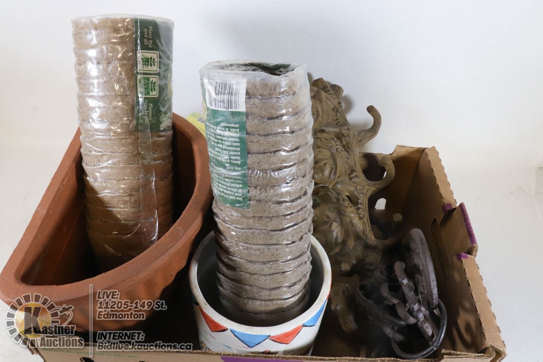 INCLUDES: PEAT POTS, TERRA COTTA WALL PLANTER, DECORATIVE CAST IRON WALL HANGER WITH FROGS AND HOOKS, DECORATIVE SET OF CAST IRON SKELETON KEYS ON A RING, CITRONELLA INCENSE AND HOLDER, ETC - ALL ARE NEW ITEMS
