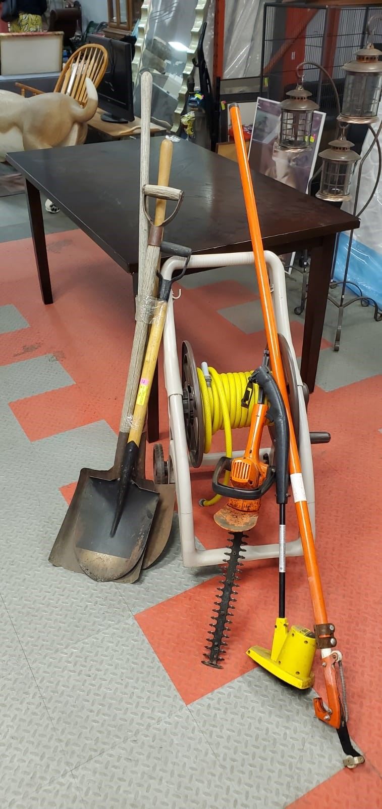 STANDING HOSE REEL, 3 SHOVELS, AND EDGER. OUTDOOR